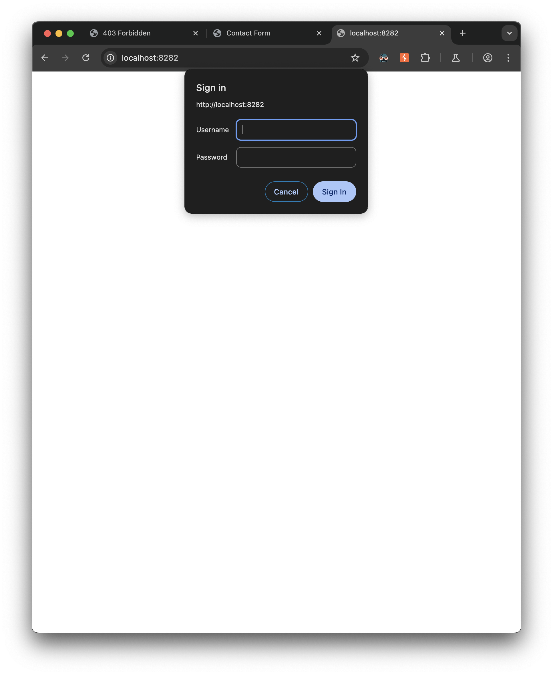 Going to localhost:8282 which I forwarded to the target’s 8080, I get a basic http auth prompt: